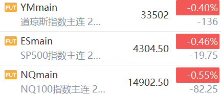 10月3日,美股三大股指期货下跌,截止发稿,道指期货跌0.40%,纳指期货跌0.55%,标普500指数期货跌0.46%。