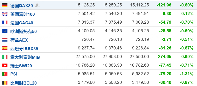 欧洲主要股指集体下跌,截至发稿,德国DAX30指数跌0.80%,法国CAC40指数跌0.78%。