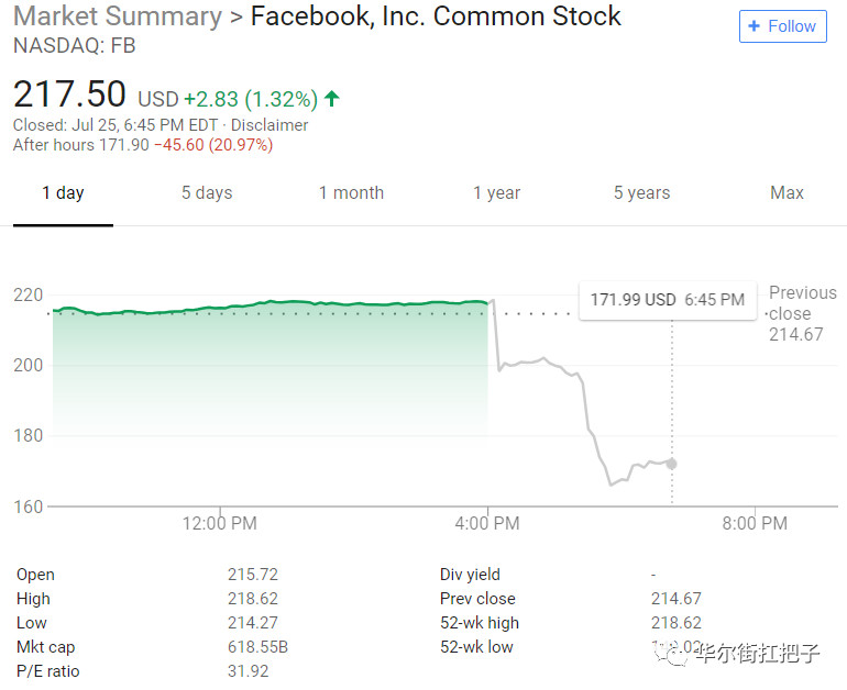 于是,一直以来都是华尔街的宠儿的Facebook,股票在盘后交易中下跌了20%+。很多年以来,FANG或者说巨头型的公司,单日跌幅都没有达到过如此之巨。