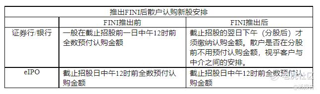 推出FINI前,证券行/银行一般在截止招股前一日中午12时前需要全数预付认购金额;推出FINI后,证券行/银行在截止招股的翌日下午(分股后)才需要缴纳认购资金,而散户是否在分股前不用预付认购金额视乎客户与中介之间的安排。