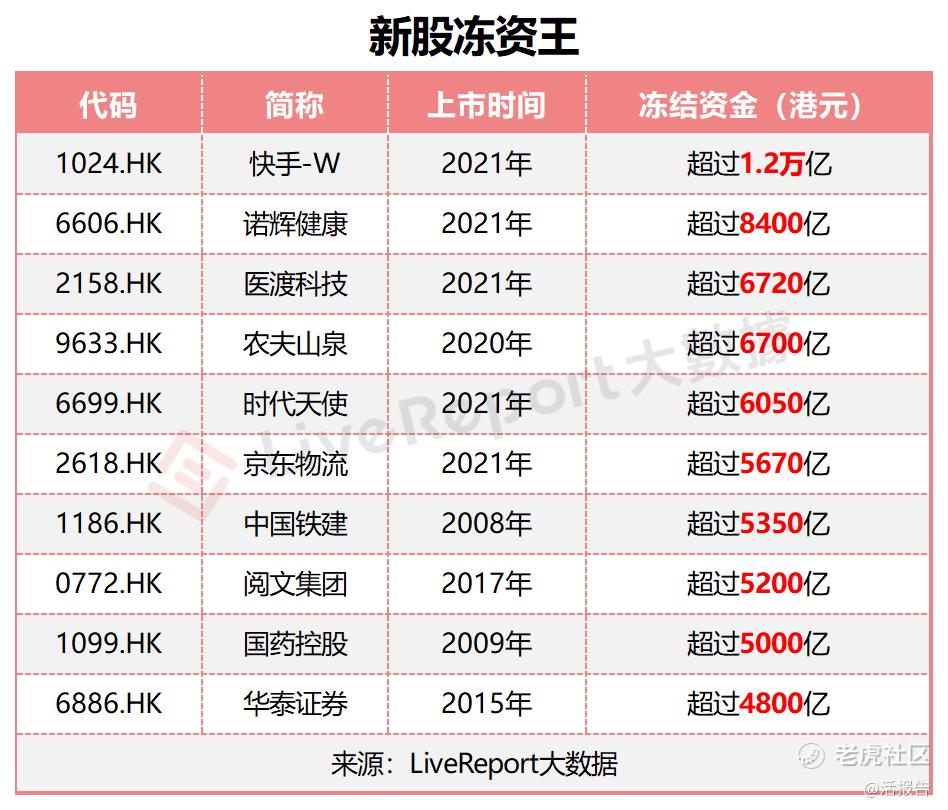 回顾港股史上的冻资记录,快手-W冻结资金超过1.2万亿港元,诺辉健康冻结资金超过8400亿港元,医渡科技冻结资金超过6720亿港元,农夫山泉冻结资金超过6700亿港元,时代天使冻结资金超过6050亿港元,京东物流冻结资金超过5670亿港元……另外,2020年蚂蚁招股时亦冻结超过万亿资金。