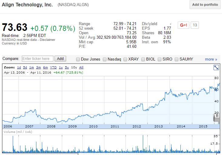 这个透明牙套最出名是Invisalign$(ALGN)$,06年以后还有个ClearCorrect,生产这个invisalign的公司叫Align Technology, 纳斯达克上市,股票表现非常不错。