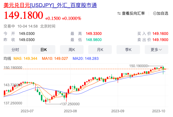 入市干预稳汇率。10月3日,美国公布8月JOLTS职位空缺961万人,超过预期880万人,进一步为美国高利率释放空间。受此影响,日元兑美元一度跌破150重要关口,在市场传闻日本央行入市干预后,日元汇率回升至149附近。