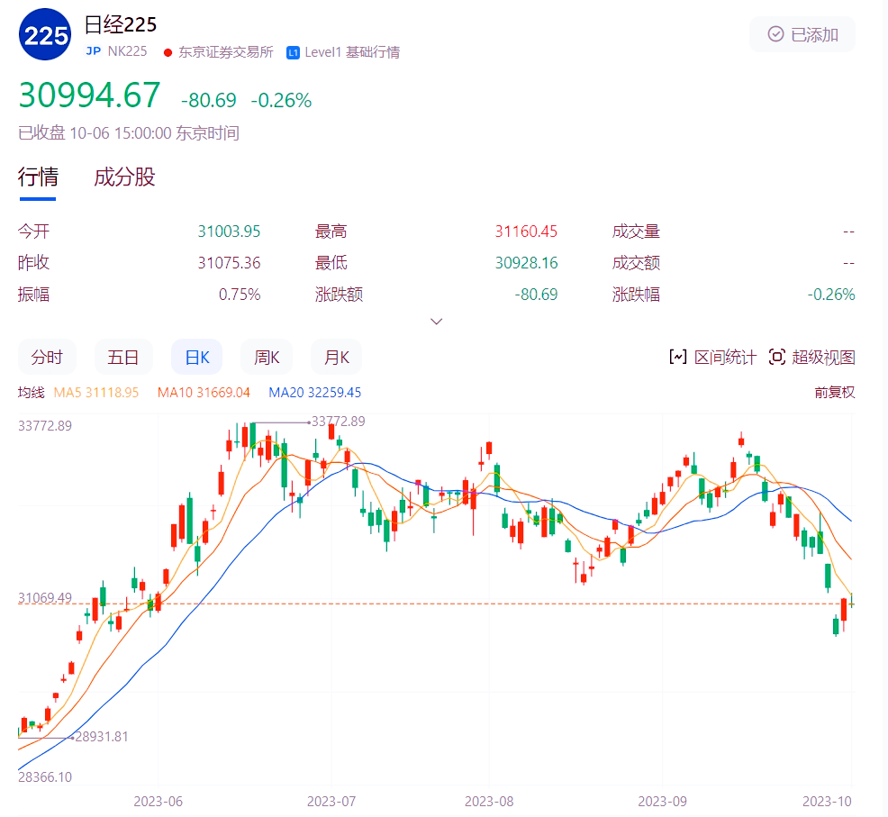 日本央行在9月金融会议上讨论了退出宽松货币政策的因素,受此影响,10月4日,日经225指数从6月最高点33600点,首次跌破31000点,为近4个月以来最低,跌幅近8%。
