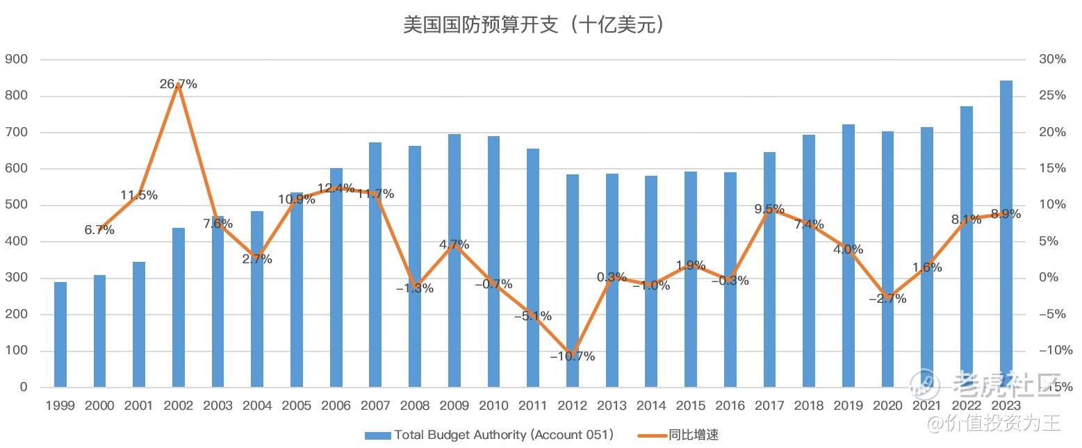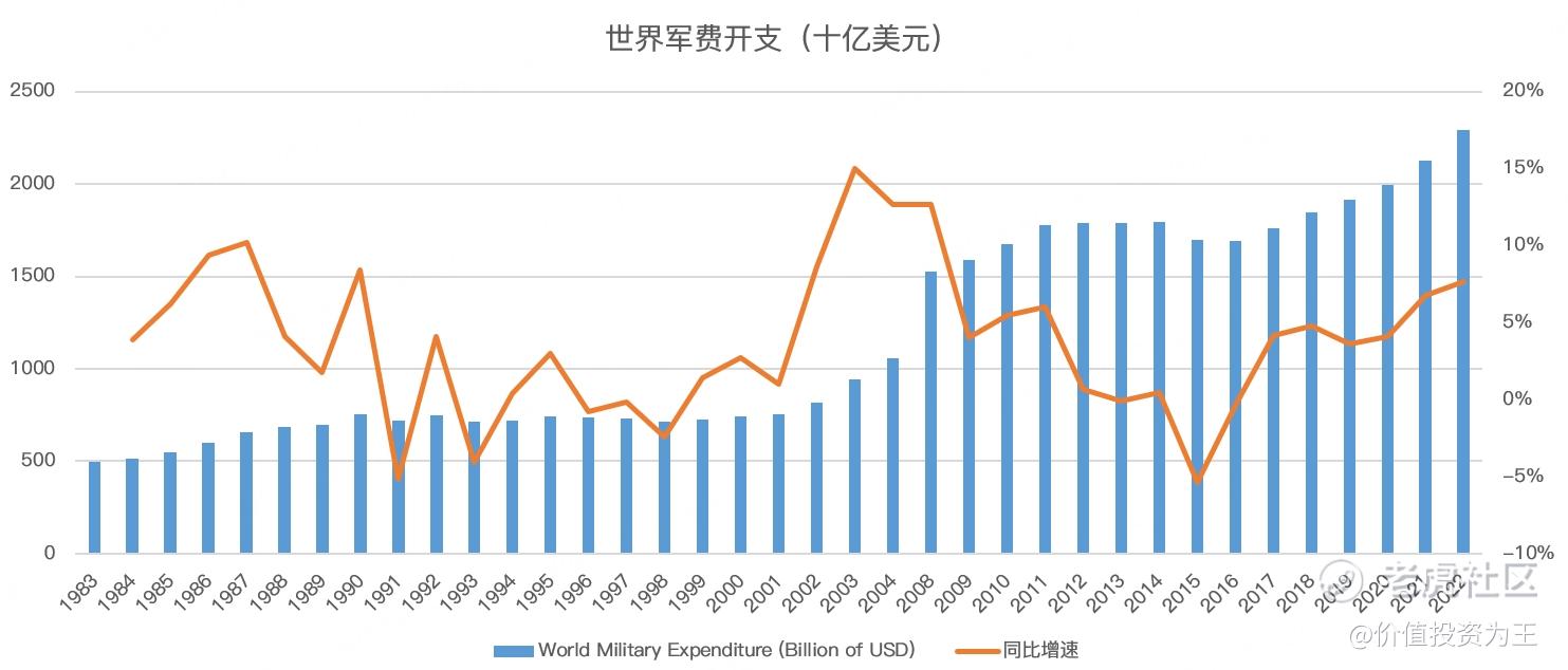 二是美国和其他各国军费开支长期增长,作为军工产品唯一的购买方,军费开支越高,军工企业能赚到的钱自然就越多,因此,长期看,军工是一个没有天花板的行业: