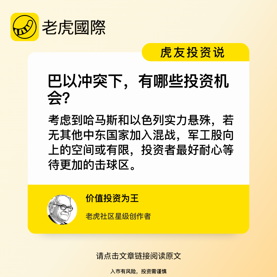 考虑到哈马斯和以色列实力悬殊,若无其他中东国家加入混战,军工股向上的空间或有限,投资者最好耐心等待更加的击球区