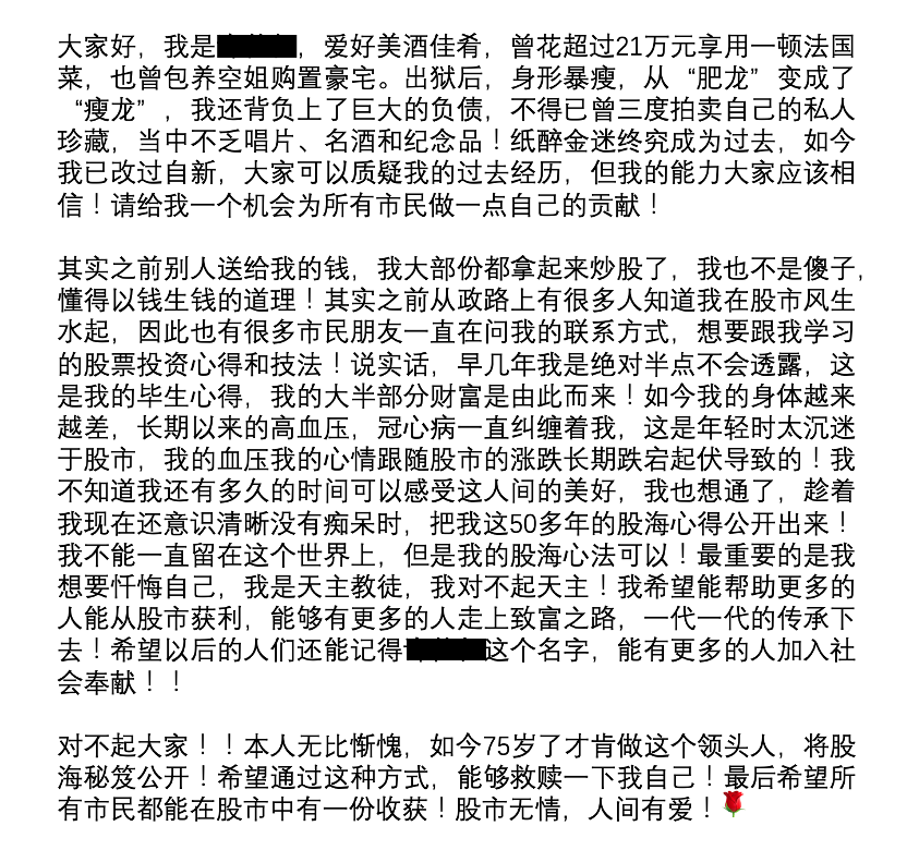 末了了再次诉诸情感,表演一个痛改前非后无私奉献敢为人先的“领头人”,希望通过分享“股海秘笈”获得救赎,哈哈哈,简直“人间有真情,人间有大爱”。