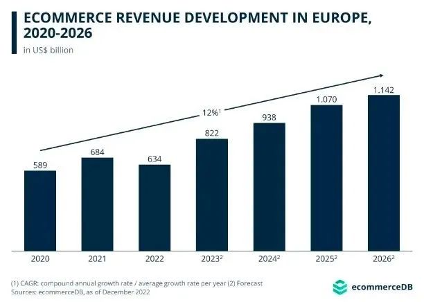 (欧洲电商市场规模持续增长 图源:ecommerceDB)