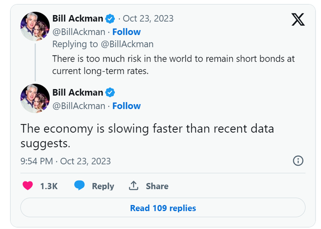 阿克曼在X(前身为$Twitter(TWTR)$)上发帖称,“按照目前的长期收益率继续做空债券,风险太大了。(美国)经济放缓速度比最近数据显示的要快。”