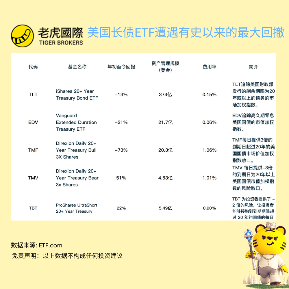 3倍做多20年+国债ETF(TMF)今年迄今跌45%,去年下跌73%,3倍做空20年+国债ETF(TMV)今年迄今涨超51%,去年涨超160%。