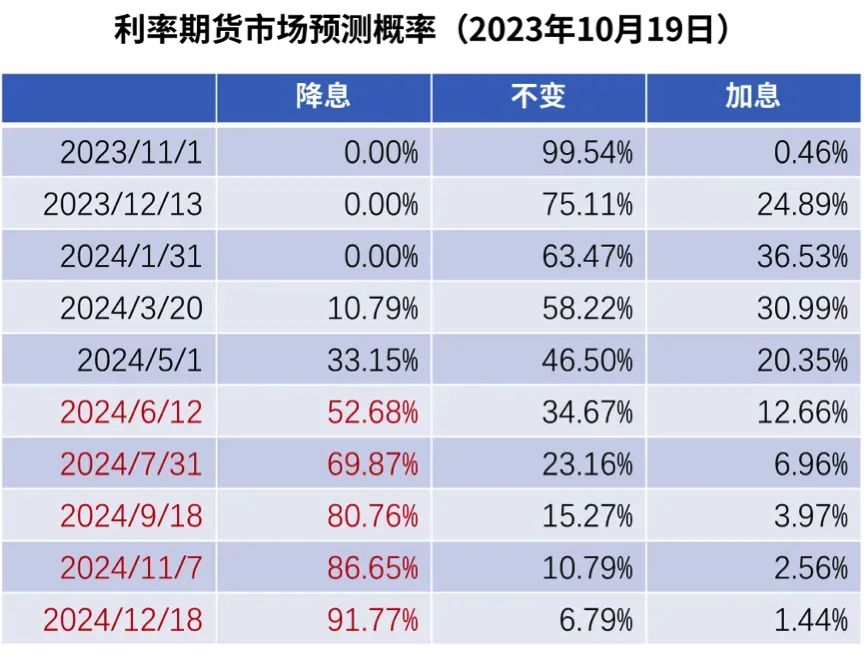 国内国外的债券买家都减少,美国财政部自然要付出更高的收益率来吸引买家,所以现在最值得担忧的事情,就是过去全球相对于投资水平的“过度储蓄”的现象,可能转化成“储蓄不足”的现象(全球能源转型,印度崛起带来的投资需求高于储蓄供应),或者是“逆全球化”加深叠加劳动人口的减少,全球通胀保持在高水平,那样美债的收益率就还会继续上升,毕竟2007年之前十年期国债收益率6-7%都是很常见的。美债配置正当时近期,“中性利率”(达到充分就业和稳定通胀的短期利率,也叫“自然利率”)抬升成为另外一个解释美债收益率飙升的原因。我们认为影响“中性利率”的因素是非常长远的宏观因素,也认同未来二十年的力量水平要比之前二十年高出1-2%,但美债收益率近期的快速上升更多还是来自短期的供需失衡。此外,虽然长端国债收益率可能保持在高位,短端利率下行仍然是指日可待的。首先,国债收益率近期的上行意味着金融条件收紧,美联储继续加息的必要性下降。10月19日,鲍威尔在纽约经济俱乐部讲话花了很大篇幅谈论过去很少提及的财政政策,也说明了国债市场的供需不平衡值得担忧,他明确指出,现在的财政赤字在高息下是不可能持续的。之后利率期货数据显示市场预计最可能的结果是,美联储今年不再加息,维持高息到明年6月降息。