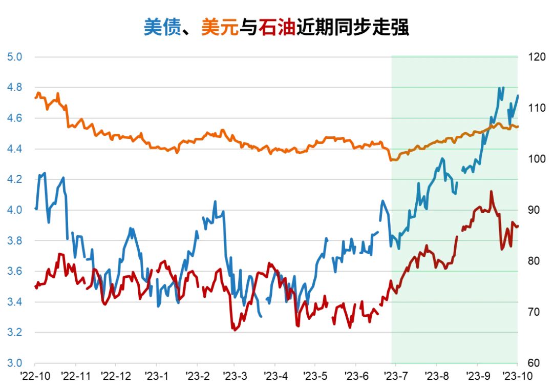 文丨夏春8月以来,投资界最受关注的话题是十年期美债收益率在7月底突破4%之后不断上涨,并且在10月初突破了4.8%,达到了2007年之后最高的水平。虽然哈马斯突袭以色列,造成避险资产暂涌入美债避险压低收益率,但这个势头仅维持了几天又再次被逆转。截止到10月19日,十年期国债收益率已经无比接近5%,接近2007年的高位。更加值得强调的是,两年期国债收益率突破了5.2%,不仅已经超过了2007年的水平,还回到了2000年的高点,其他更短期限的国债也同样如此。石油价格与美债收益率的互动7月以来,全球股市下行的背后,除了美债收益率上涨带动了美元上涨,石油价格的上涨构成了额外的压力。今年石油价格从低点到高点涨幅超过了40%,这还是发生在美元走强,中国经济疲软的背景下,可见供需矛盾主要来自于供给端。一是主要经济体的减碳政策和投资者的ESG压力导致了能源行业的长期投资不足;二是俄罗斯与沙特在产量上限和减产方面的协调行动加剧了供应短缺。不过,虽然全球经济增长将受到油价上涨的影响,但美国经济相对表现更好,页岩油革命后,美国已经成为石油和石化产品的净出口国,美债、美元和黄金会成为全球资本的避风港。