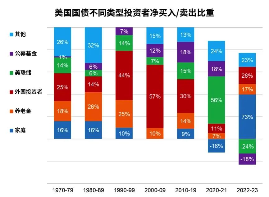 在海外,银行利率也跟随债券收益率上涨。国内降息带来了人民币贬值和利息减少的双重压力。有海外账户的家庭都在考虑美元或者港币银行定存,或者买入美债享受高息。相比之下,银行定存安全度最高,但流动性不佳,而且没有升值的空间。而美债具备高流动性,一旦降息还可以享受价格上涨带来更高的总回报,当然风险是利率上涨债券价格会下跌,但只有持有到期,就仍然可以享受买入时锁定的高息。如果要买美债,肯定要知道美债的持有人结构。在70年代,美国家庭是国债最大的购买者,占比超过30%,随后公募基金、养老金、外国投资者和美联储的占比逐渐加大(值得一提的是,美联储的分类里把对冲基金算入家庭)。截止到今年二季度,家庭直接持有国债的占比只有9%,当然许多家庭是通过公募基金和养老金来间接持有美债。大家仔细看会发现自从美联储2022年开启加息周期以来,美国家庭直接持有国债的占比明显增加。实际上,数据显示,2022年到今年二季度,73%的国债是被美国家庭买去了。相反,美联储和公募基金是主要的卖家。而2020-21年,美联储维持低利率,家庭是国债最大的卖家。
