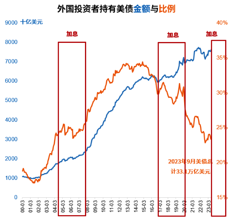 目前来看,以色列延长了加沙居民南迁的时间,尚未发动大规模地面进攻。历史上巴以之间的局部战争对油价的影响有限,战争扩大到更广泛的中东地区则会刺激油价。一个概率较小但不能排除的极端风险是以色列袭击伊朗的核设施,以报复伊朗对哈马斯和黎巴嫩真主党的支持行为。这种情况下,伊朗可能会封锁霍尔木兹海峡,影响全球大约四分之一的石油供应,石油价格有可能飙升至每桶120-150美元。能源价格的大幅持续上涨将带来滞胀冲击,这对大多数风险资产来说都是坏消息。极端情况将倒逼美联储加息,刺激美债收益率短期继续上升,但更高的油价和更高的利率将削弱需求,加大经济衰退的可能性。美联储就必须快速降息,债券收益率也会大幅下降。虽然具体时点难以判断,但方向性相对确定。美债收益率为何突然飙升?要知道虽然美联储持续加息11次,但去年11月到今年7月十年期美债收益率都在4%以下,而且7月之后美联储并未加息,市场对未来通胀的预期也没有什么变化。都说美债收益率是定价之锚,那么到底发生了什么事情?大家众说纷纭,有一些说法明显不靠谱,比如美国众议院议长被罢免,两党争执导致政府可能关门带来了信心危机;日本央行可能收紧货币政策,影响美债收益率(美债价格变化对日债的影响更大,日本央行仍然在执行收益率控制政策,压低收益率)等等。我来说说更靠谱的原因。8月1日,惠誉下调了美国主权信用评级,认为频繁发生的债务上限谈判僵局,和最后期限前达成决议的行动上,充分体现了政府治理水平的下降。更重要的是,美国2023-2025年的财政状况趋于恶化,联邦政府债务居高不下而且不断攀升。惠誉估计美国广义政府赤字占GDP比重会从去年的3.7%上升到今年的6.3%和2025年的6.9%。美国的利息支出与财政收入比值或将在2025年达到 10%,而AAA与AA评级主权国家这一指标的中值分别为1%和2.8%。对应的是,广义政府债务占GDP比重今年将达到112.9%,2025年升至118.4%,比AAA评级主权国家39.3%的中值与AA评级主权国家44.7%的中值高出2.5倍以上。对市场来说,这是一个非常重要的信号,因为下调评级意味着美国发行债务的成本上升。但也有很多人的第一反应是不以为然,认为惠誉只是老调重弹,下调评级未必带动国债收益率上涨,因为2011年标普下调美国主权信用评级后,美债收益率不升反降,一年内最大下跌了42%,股票和债券双双上涨。但这一次显然不一样,惠誉话音刚落,国债收益率就开始上涨,美国政府的一举一动也在验证惠誉的判断。此前,债务上限谈判导致债务发行计划受阻,供应减少导致7月前国债利率被压低。僵局解决后,联邦债务从一季度的31万亿美元快速上涨到现在的33万亿,下半年国债发行规模接近1.9万亿美元,大大超出了市场的预期。这背后除了拜登政府对芯片、新能源等重振美国制造业的巨额财政补贴之外,还有个人所得税下降带来的财政收入减少。哈以冲突之后,拜登计划向国会额外申请1000亿美元作为以色列、乌克兰以及印太地区的国防援助,再次刺激国债市场。债券市场的供需关系变化影响价格和收益率,相对来说,需求端的变化更值得关注。过去20多年,美国联邦债务规模不断上升,但美国国债从来不担心卖不出去,因为全球出现了“过度储蓄”的现象,包括中国、日本、欧盟、石油输出国在内的贸易顺差国,加上美国的高科技公司都追求安全资产,美债成为首选,需求大于供给,所以不仅不愁卖,还可以用更高的价格,也就是更低的收益率,卖掉。除了他们,美债还有一个大买家就是美联储自己。为应对金融危机和新冠疫情,美联储多轮“量化宽松”买下了8万多亿美元的国债。但是这一次显然不一样了,美联储正在实行量化紧缩,缩小资产负债表,没法像以前那样大手大脚,而且美国国债的外国买家,即使没有减仓,也没有多少动力加仓,原因在于美债已经连续三年亏损,创下了70年代末以来的最差纪录。三月份,硅谷银行等地区性银行不堪重负而倒下。