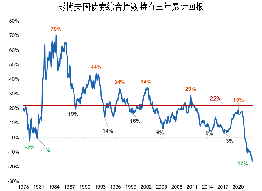 显然,现在买入美债的时间点比之前更好,美国高通胀和持续加息导致美国债券市场下跌,到今年9月已经持续了38个月了,是1976年以来的数据里表现最差的时期。债券综合指数三年累积持有的回报-17%,也是1976年以来的历史最差表现。上一次美国国债连续三年下跌发生在高通胀的70年代末期。但随着美联储在80年代完成加息开启降息后,债券综合指数持有三年累积回报在85年高达70%,数据显示三年累积持有债券的平均回报是22%。从历史表现来看,现在买入美债持有三年获得高回报的概率非常高。