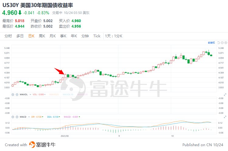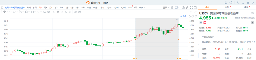 10月23日,10年期美债收益率达5.021%,续创2007年以来的新高。