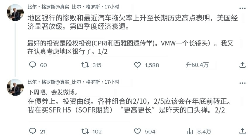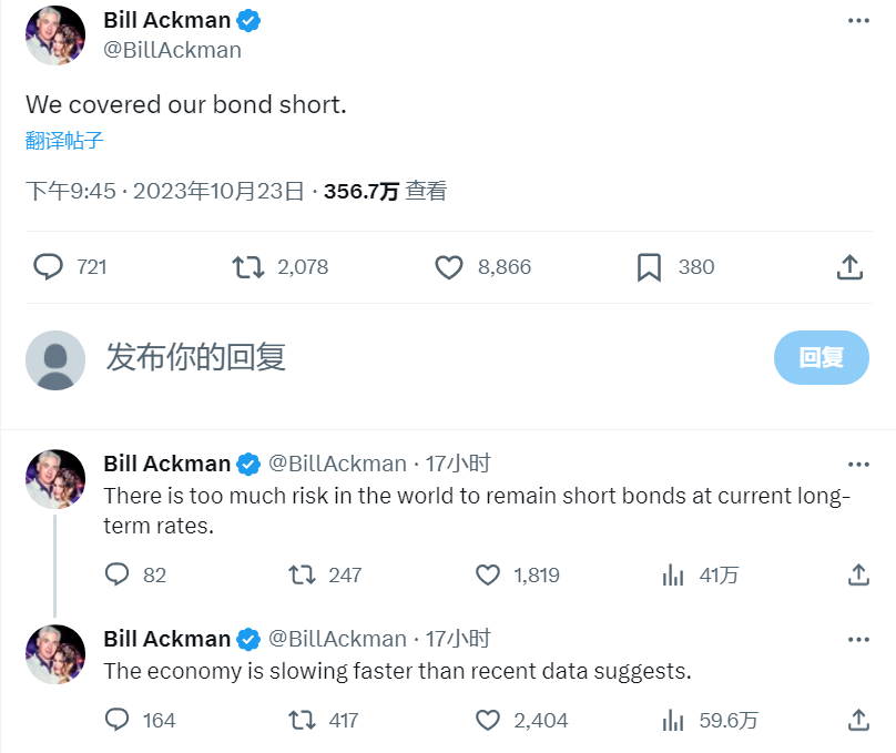 而在昨夜长期美债收益率突破5%时,Ackman就以美国经济放缓为由平仓止盈。同时,Bill Gross也发布推特称,他预计年底前美国将出现衰退,他正在买入短期利率现货,如果短期利率下降,他将获得回报。