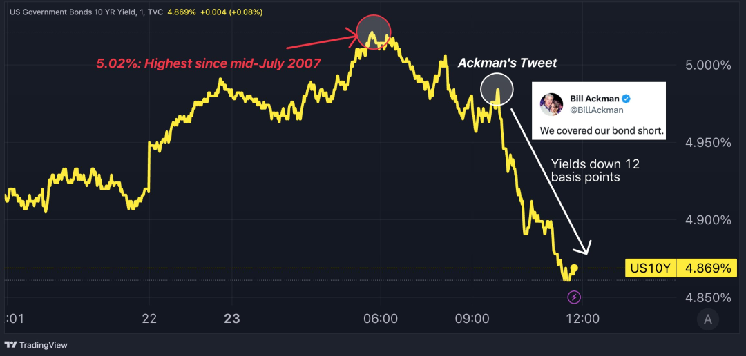 值得注意的是,在Bill Ackman表示平仓后,10年期美债收益率从4.96%跳水至4.8%,10年期美债收益率一天内跌去2.6%。