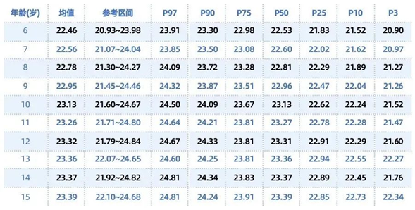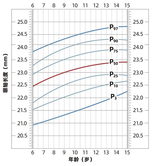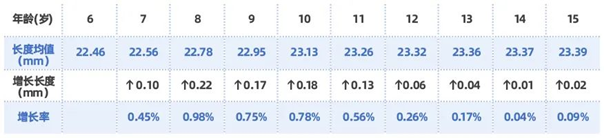 其中6~15岁学龄儿童眼轴长度的变化数据,如下图: