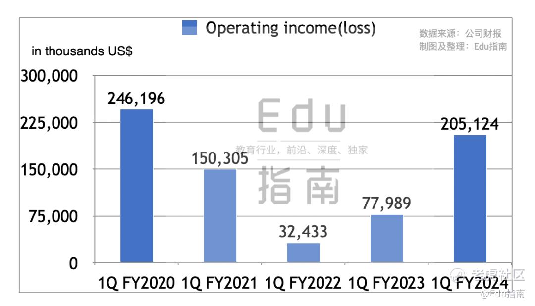 本财季新东方公司经营利润为2.1亿美元,上一财年同期该项利润额为0.8亿美元,本财季同比增幅显著,达163%。本财季经营利润为近四个财年Q1最高表现,但稍低于2020财年Q1同期利润的2.5亿美元。