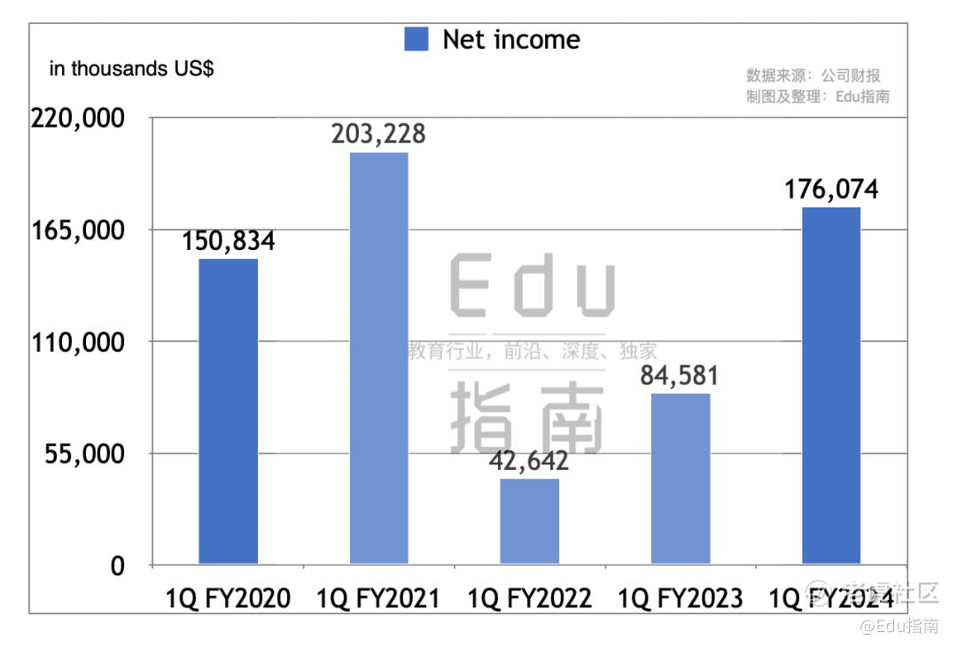 新东方公司近五个财年Q1业绩中,2022财年Q1(截至2021年8月的三个月)营收最高,达13.1亿美元。此后行业各家公司经历业务裁撤,新东方亦进入新业务探索与转型时期,当前最新季度营收仅次于2022财年Q1业绩,高于转型前更早时期2020财年Q1、2021财年Q1营收表现。