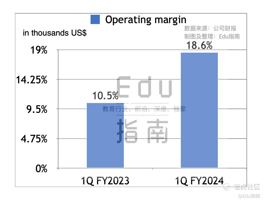根据季报,新东方公司2024财年Q1营业利润率为18.6%,相较上一财年同期的10.5%,该利润率增幅为显著。
