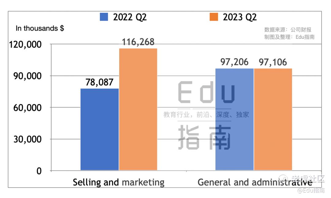其中本季度好未来公司销售与营销费用为1.2亿美元,同比上一财年同期的7809万美元,该费用增幅为49%。该公司Q2一般与行政费用为9711万美元,上一财年同期的9721万美元,本季度该费用同比微幅减少。