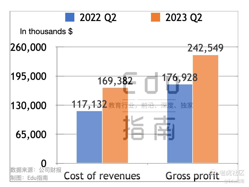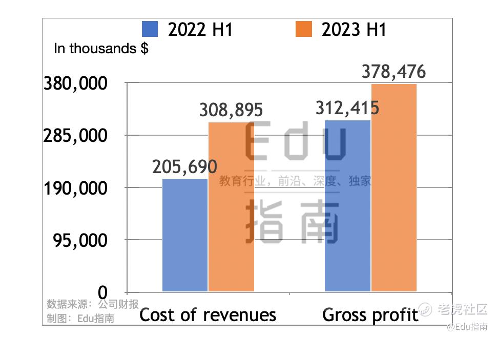 今年7月该公司发布其2024财年Q1(截至2023年5月)业绩报告,根据该季报,好未来公司营收2.8亿美元,增长23%,该公司2023财年Q1营收同比2022财年同期(截至2021年5月的三个月)营收的13.8亿美元,表现为下降84%。该财季营收变化,同样表现为由下降转为增长。该季度好未来经营现金流转正,净流入1.3亿美元。其Q1财季收入成本为1.4亿美元,同比上一财年Q1的0.9亿美元,该成本增幅为58%。