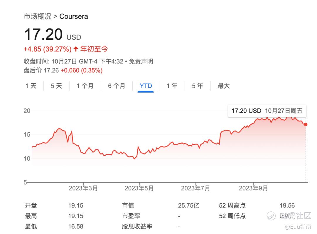 2023财年截至本季度的九个月,Coursera公司营收为4.7亿美元,同比上一财年同期的3.8亿美元,前三个季度营收增幅为22%。