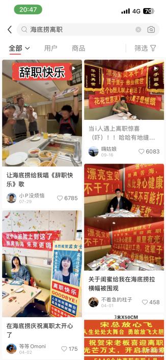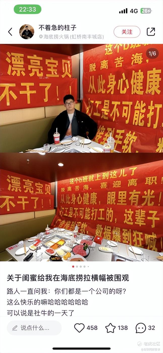 比如,i人害怕e人狂喜的离职横幅,多到一个墙面都挂不下。离职人更是攻占了海底捞,海底捞的生日快乐歌也成了每一位离职人的必点欢送曲目,建议海底捞更新一个离职快乐歌,“跟所有的烦恼说拜拜”可以说是唱出了离职人的心声。