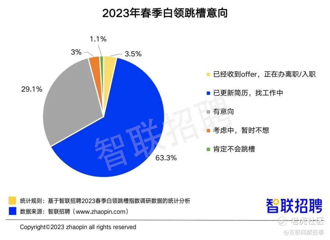 根据智联招聘发布的《2023春季白领跳槽指数调研报告》显示,今年春招季有跳槽意愿或行为的白领超9成。其中,63.3%的白领“已更新简历,找工作中”,有29.1%的白领“有意向”跳槽意向,有3.5%的白领表示“已经收到offer,正在办离职/入职”。也就是说,超9成的人不是在办理离职,就是在准备离职的路上。