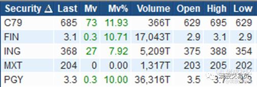 涨幅大于10%,成交金额>50万澳元个股: