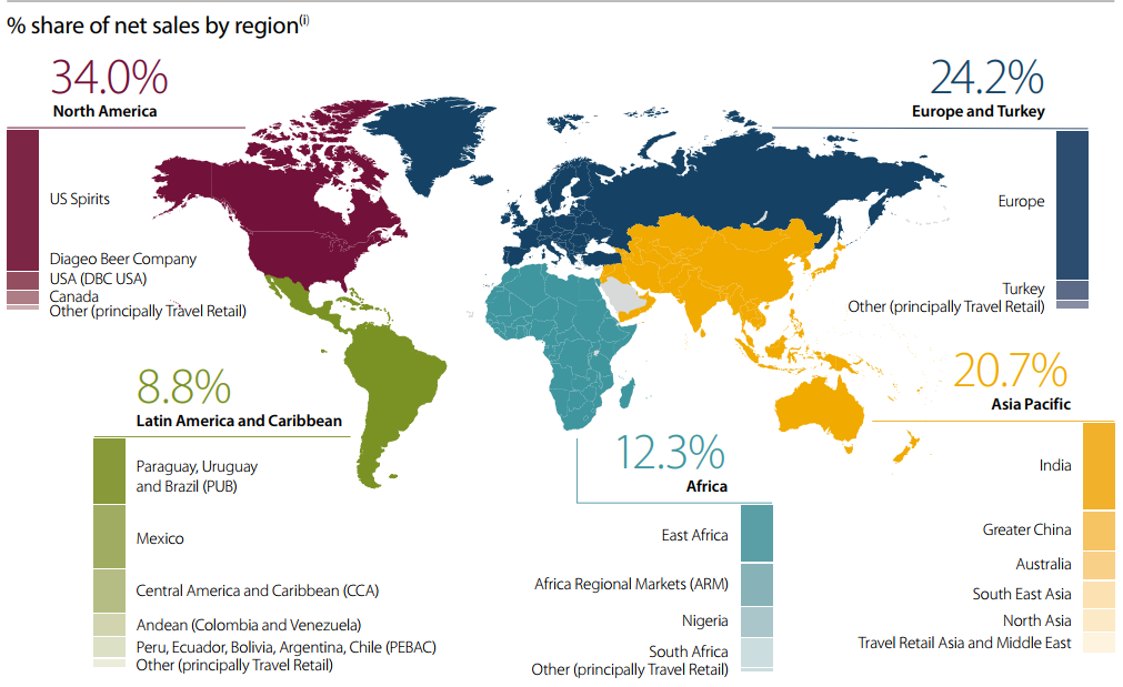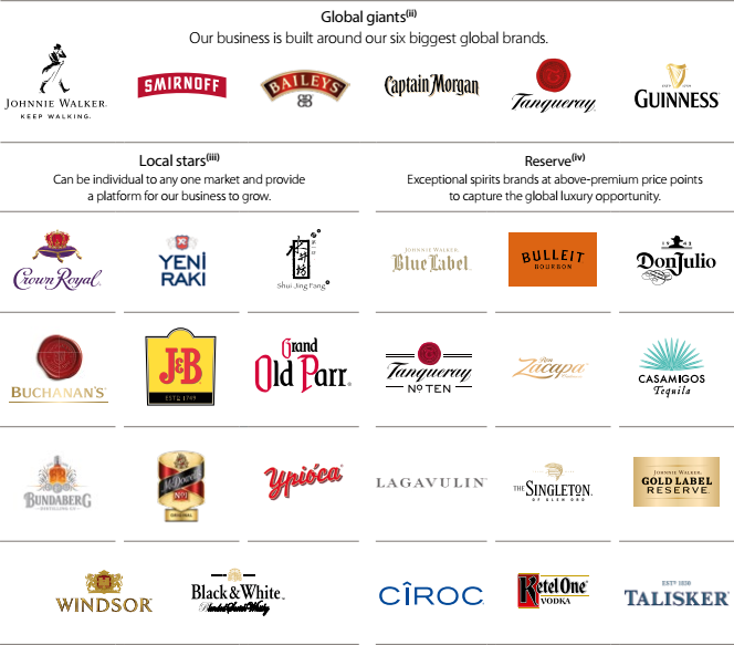 Diageo酒品类型十分齐全包括苏格兰威士忌、北美威士忌、伏特加、朗姆酒、龙舌兰、杜松子酒等品类。被人们熟知的品牌包括:JohnnieWalke、J&B、Windsor、 Smirnoff、Baileys、Captain Morgan等。并且Diageo很早就开始在中国白酒市场布局。