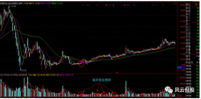 阳线开始逐步增多,阴线开始减小;同时成交量也是连续放出堆阳,堆阴开始减少;