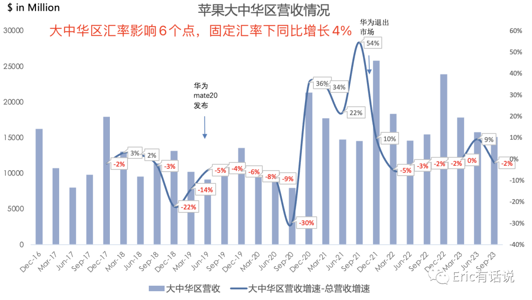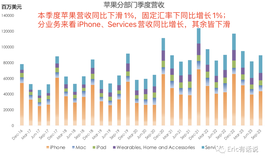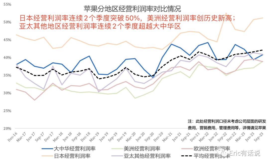 大中华区营收151亿美元,同比下滑2%,汇率影响6个点,固定汇率下是增长的;大中华区经营利润率40.8%,连续2个季度被亚太其他地区反超;本季度仅美洲营收同比增长。(苹果上季度提及印度、中东、东欧营收都划分在欧洲口径内)
