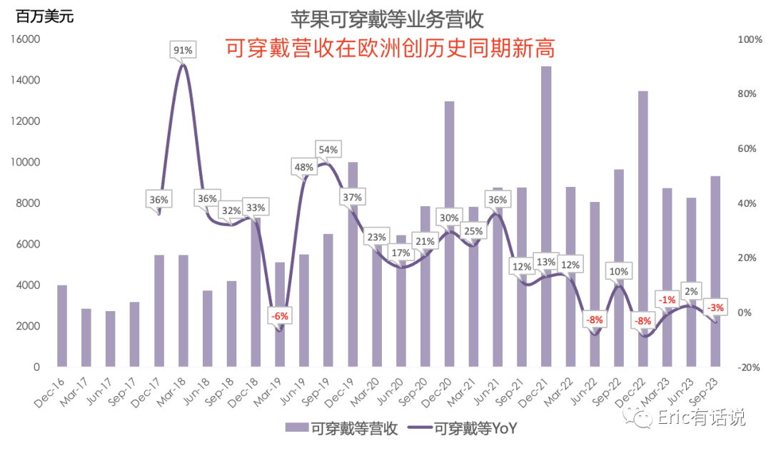 可穿戴等营收93亿美元,同比下滑3%,可穿戴营收在欧洲创历史同期新高。