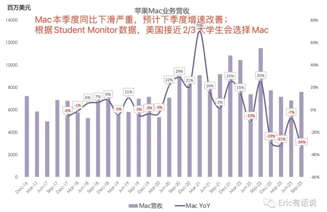 Mac营收76亿美元,同比下滑34%,根据Student Monitor数据,美国接近2/3大学生会选择Mac,未来不会用回外部芯片;iPad营收64亿美元,同比下滑10%。
