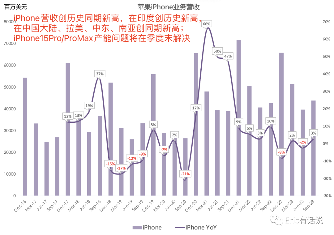 iPhone营收438亿美元,同比增长3%,创历史同期新高;iPhone在印度创历史新高,在中国大陆、拉美、中东、南亚创同期新高;iPhone15Pro/ProMax产能问题将在季度末解决。