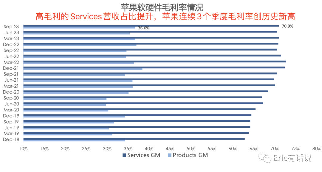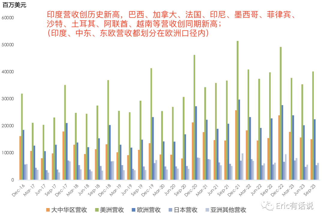 苹果在全球众多市场继续攻城略地,印度营收创历史新高,巴西、加拿大、法国、印尼、墨西哥、菲律宾、沙特、土耳其、阿联酋、越南等营收创同期新高;本季度企业服务拿下星巴克、GoTo大单,星巴克配备数万部iPad、M2 MacAir,GoTo一半员工用Mac办公。