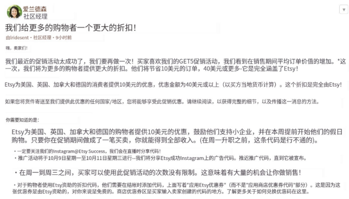 继亚马逊举办10月秋季大促取得亮眼成绩之后,不少电商平台纷纷效仿推出自己的秋季促销活动,Etsy便是捕捉到风口的其中一位。为了抢夺这波旺季流量,Etsy在10月9日至10月11日举办了一场闪购活动,不得不说,Etsy非常大手笔。据悉,在活动期间,美国、英国、加拿大和德国的消费者可以享受到每笔订单满40美元立减10美元的优惠,且优惠次数没有限制。此外,参加这场促销活动的卖家所提供的的所有折扣优惠都由平台自掏腰包。