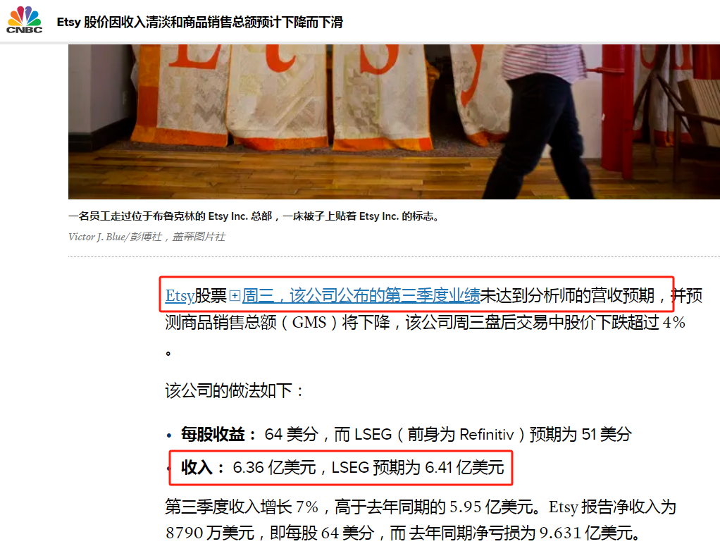 近日,美国手工艺电商平台Etsy发布了截至9月30日的第三季度财务报表,数据显示,第三季度Etsy营收为6.36亿美元,虽然同比去年的5.95亿美元有所增长,但营收依然不及分析师预期的6.41亿美元,由此Etsy股价也在盘后交易中下跌了超过4%。
