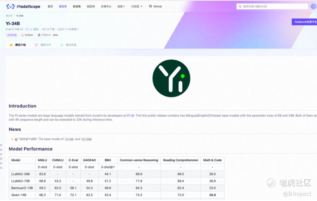 同一时刻,Yi-34B,模型开放商用申请,已在阿里云魔搭社区ModelScope首发。魔搭第一时间推出了模型部署相关教程,供开发者参考并快速上手。