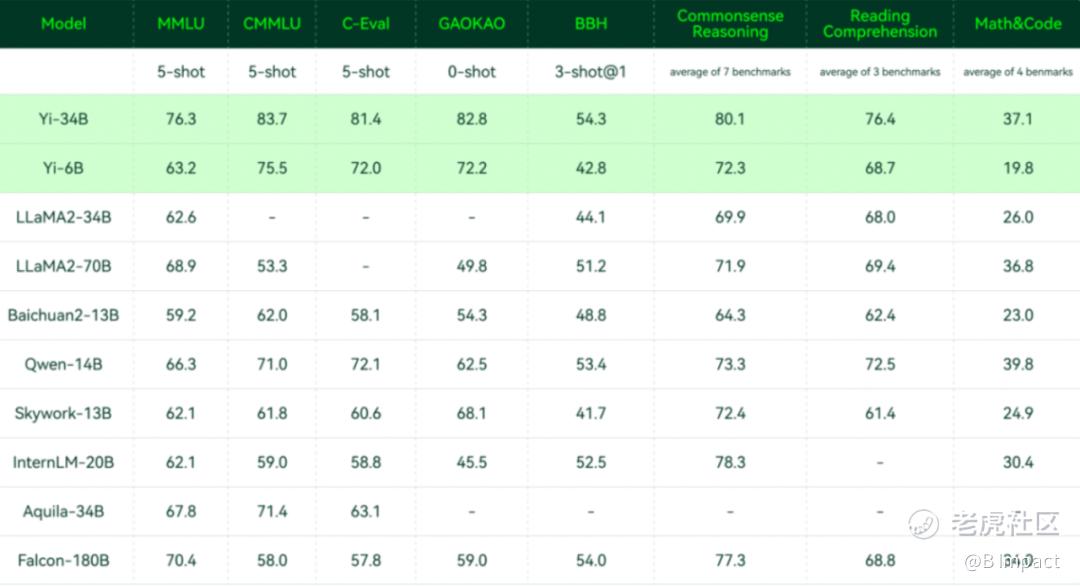 11月6日,李开复带队创办的 AI 2.0 公司零一万物,开源发布了Yi系列模型,包含 34B 和 6B 两个版本。Yi-34B 相当于只用了不及 LLaMA2-70B一半、Falcon-180B五分之一的参数量,碾压 了LLaMA2-70B 和 Falcon-180B 等众多大尺寸模型。