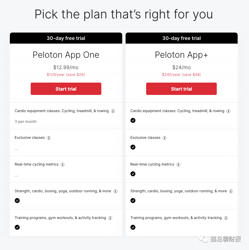 调整后,他们发现效果超出预期。此外,由于 Peloton App 会员 现有的两个付费档次(12.99 美元和 24 美元),他们发现大多数用户选择了 24 美元的档次。这个调整后的策略将成为他们未来的主要方向。