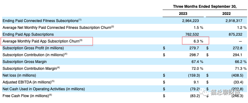 此外,Peloton 从本季度开始,在财报中开始披露 App 付费用户的月度流失率。这是一个非常重要的指标,用于观察 Peloton 新模式是否可行。本季度的 App 用户流失率为 6.3%,也就是说,在 100 个付费 App 用户中,每个月大约有 6.3 人流失。这与之前硬件付费用户的流失率相比要高得多。硬件付费用户的流失率通常保持在每月平均 1% 的水平。由于 App 的付费门槛较低,整体流失率会更高一些。