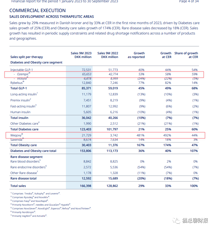 诺和诺德的财报显示,他们的业绩主要受益于胰高血糖素样肽 1(GLP-1)糖尿病治疗和肥胖症治疗板块的推动。在 GLP-1 糖尿病治疗领域,这一季度同比增长了 45%。而在减肥药领域,他们实现了 167% 的增长,增速非常惊人。此外,诺和诺德他再次提高了全年的营收预期,预计同比增长 32% 到 38%,营业利润增长 40% 到 46%。