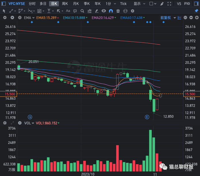 由于上述种种原因,VFC 的股价在财报发布后出现了大幅下跌,连续两天下跌。股价最低下探到了 12.8 美元,创下了该公司的历史新低。VFC 公司要恢复增长看上去还需要一定的时间。