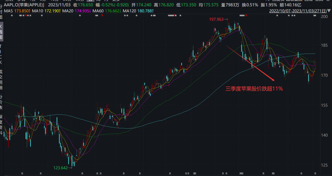 三季度伯克希尔净利润出现亏损的一个主要因素就是其股票投资组合中,苹果公司占了大部分。这家科技巨头的股价在第三季度整体下跌了11.61%。