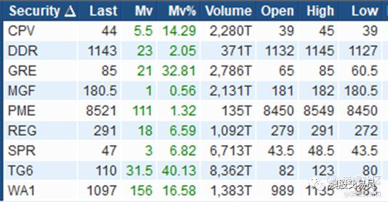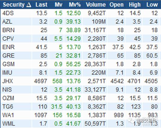 涨幅大于10%,成交金额>50万澳元个股: