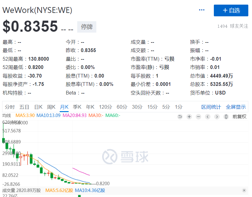 WeWork股价已经跌至约10美分左右,周一停牌前大约在83美分左右交易。